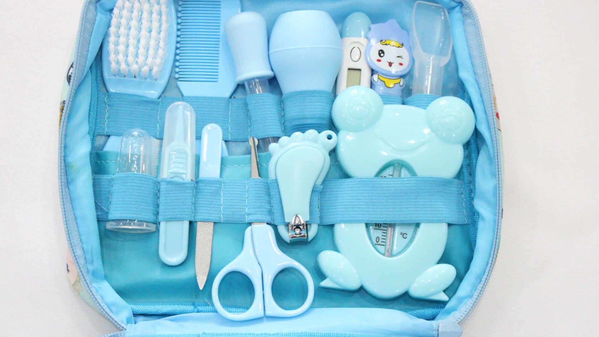 - 13 in 1 Baby Grooming Kit: The package comes with the baby grooming kit, including baby nail file, Newborn hair brush, Baby's comb, finger toothbrush, tweezer, nasal aspirator, baby scissors, medicine dropper, portable blue EVA bag, Alcohol prep pads and measuring spoons(ml). This 13 in 1 grooming kit can be used for our newborn baby's daily needs.