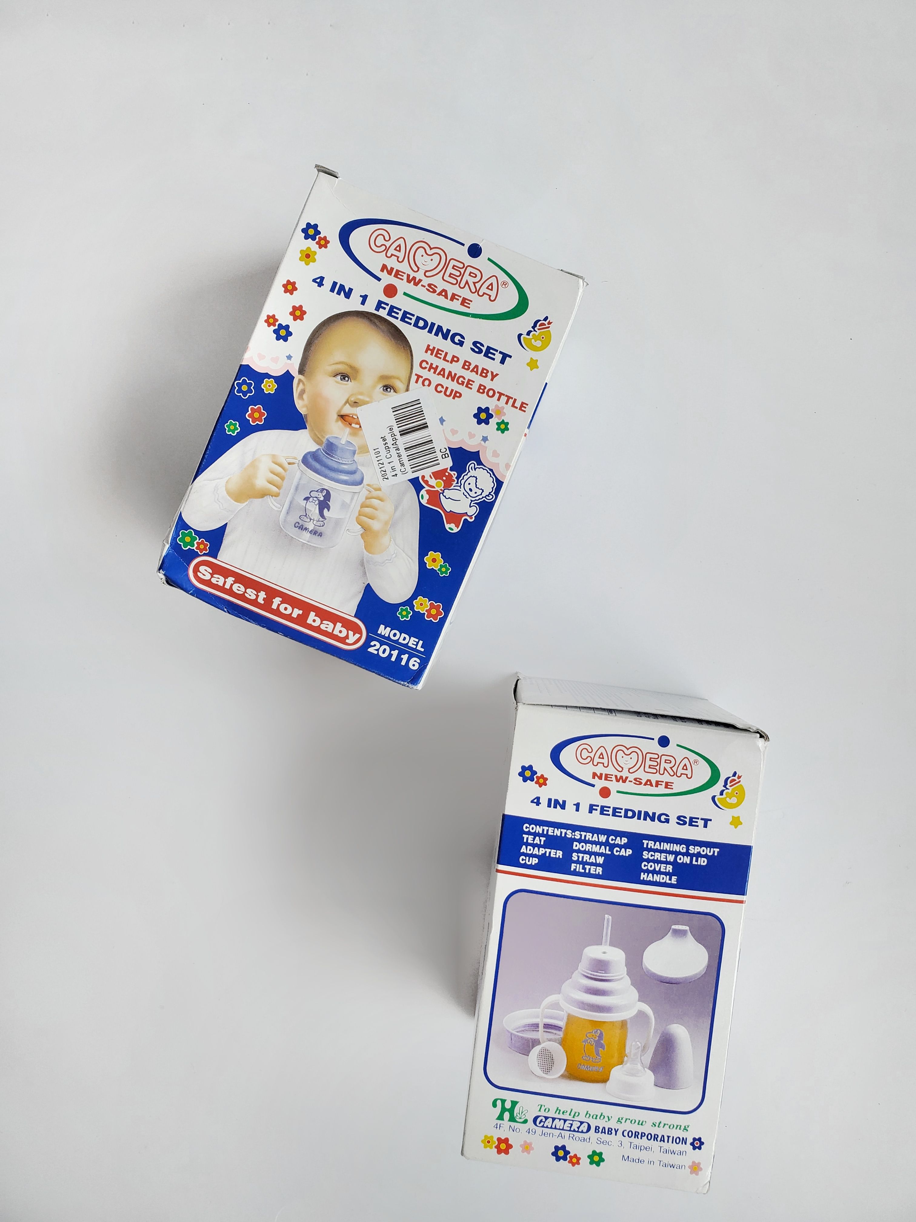 It includes; Nursing cup, Training cup, Straw cup, and Baby cup. Specially designed camera 4 in 1 feeding set with multiple changeable parts helps you follow your child's growth. It promotes easy transition from bottle to cup. This feeding set offers gripper handles for baby easier grip and try to suck milk itself.