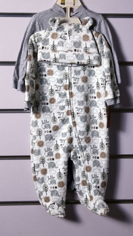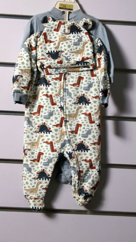 Set includes 2 long sleeve overalls and either a cap or hair band 100% cotton machine washable. Opens in the front one with button strap and the other with zip